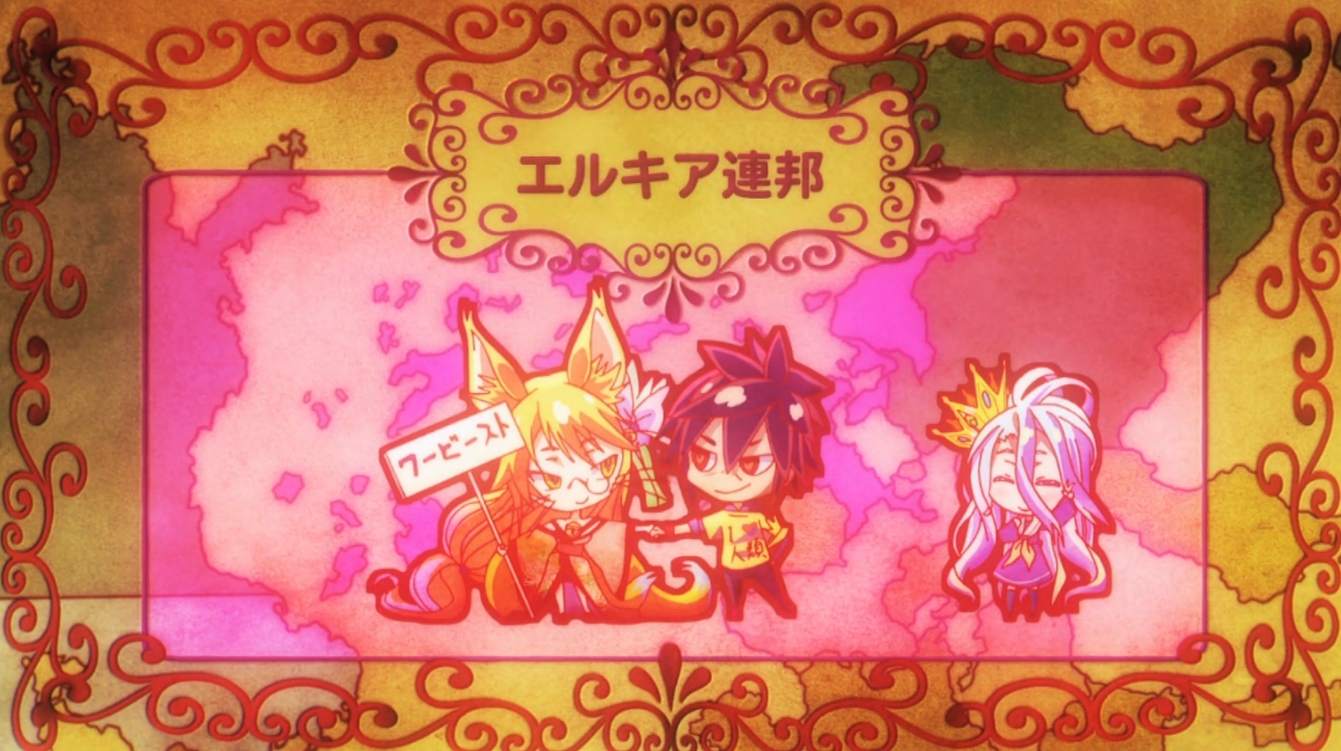 The Commonwealth of Elkia (エルキア連邦, Erukia renpō) is a commonwealth/federation consisting of several races of the Ixseed that have lost or drawn in games with the Immanity. These races, however, self-rule their respected territories. Its capital is Elkia City. While Sora and Shiro are the representative rulers of both Immanity and Werebeast, Miko is allowed for self-rule for the Werebeast. Due to Miko having an Old Deus in her body, it's possible the infusion of the two races does not apply to it. It's currently unknown if this means Miko can bet her race piece if the situation arises. Both the Flügel and the Ex-Machina are not under the rule of Sora and Shiro, but they will follow their orders as allies.
